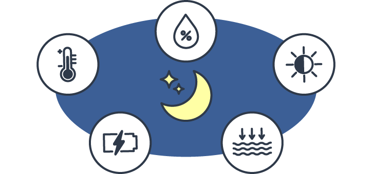 「温度」「湿度」「照度」「気圧」「内蔵リチウムイオン電池の電圧値」の5種類の環境データを自動取得