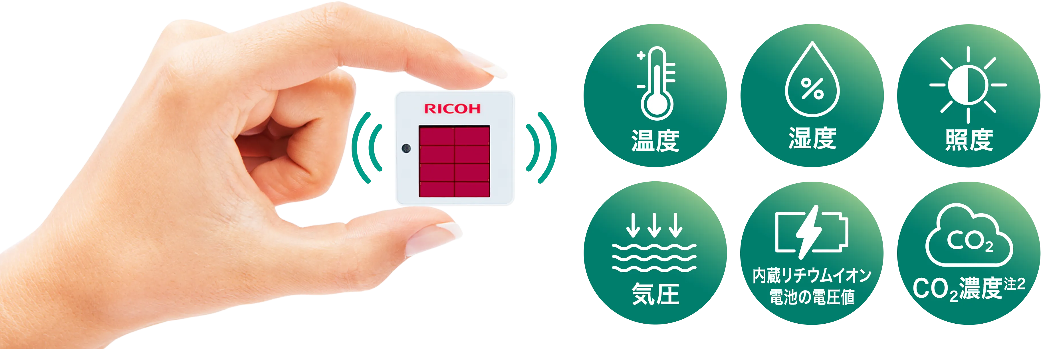 リコーは、エネルギーハーベスティング(EH)の発想から室内のわずかな光で発電する次世代太陽電池を開発しました。この電池を超小型センサーに搭載することで、多地点での気温や湿度などの記録作業を自動化。さらに、多様なデータを「見える化」し、素早く届けるクラウドサービスとの組み合わせにより、製品環境と現場で働く皆さまの環境を遠隔で見守り、改善を実現するソリューション「RICOH EH SensorCloud 2(リコー EH センサークラウド・ツー)」が生まれました。