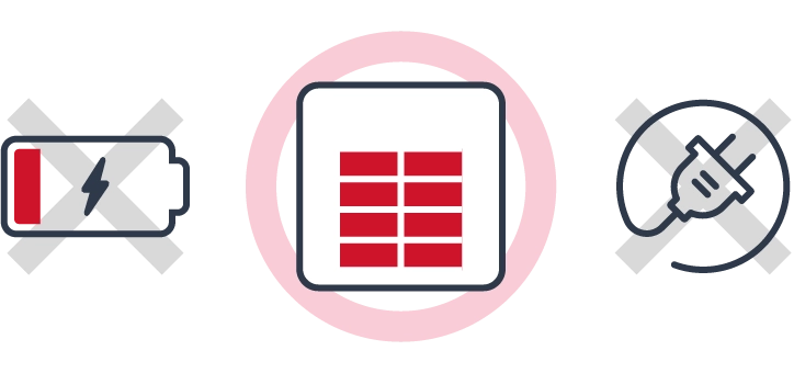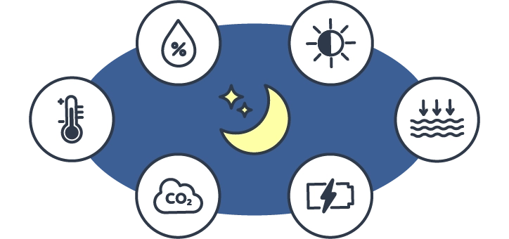 EH センサーが、「温度」「湿度」「照度」「気圧」「内蔵リチウムイオン電池の電圧値」「CO2濃度注2」などをセンシング。現場環境を把握するために必要な情報を自動でキャッチします。室内の微弱な光でも動作可能な次世代型太陽電池を搭載した自立電源のため、暗い場所や夜間でも連続でデータを記録。電池交換や配線の手間がありません。