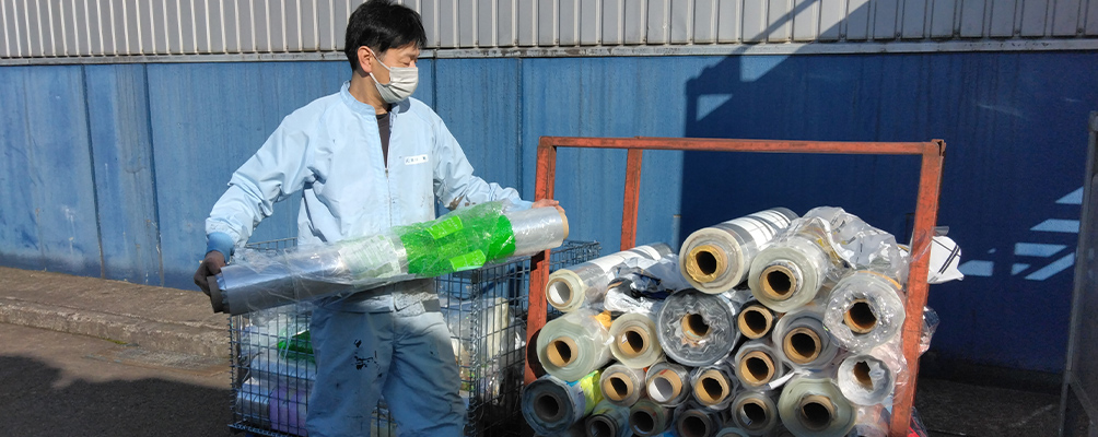 当社では全社的で品質ISO9001を取得。また、環境のISOであるEMS(環境マネジメントシステム)は兵庫工場、大阪本社工場、及び野田工場の3工場で取得しています。廃プラスチックや産業廃棄物を減らす方法として、分別回収は会社として必須になっています。当社が製造及び使用しているプラスチックフィルムは、原反段階では素材が分かるのですが、加工すると分からなくなってしまいます。その残材および端材となった廃プラスチックフィルムは、素材が容易に分からないため分別回収が困難であり、その結果、有価取引やリサイクルができなくなってしまうという課題がありました。