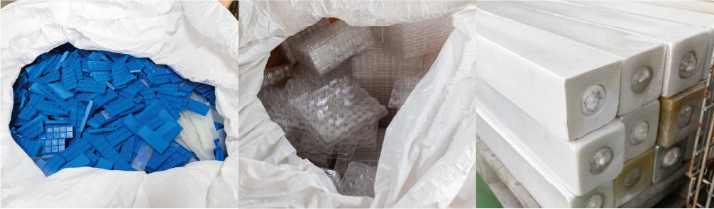 廃棄物の削減に取り組む中で、身近な存在であるプラスチックに着目し、2年前から廃プラスチックの「有価物化」への取り組みをスタートしました。従来は費用を払って業者に引き取ってもらっていたものを価値あるモノに変えるための取り組みですが、有価物として引き取ってもらって原材料化するためには、PPやPS、PEといったプラスチックの材質毎に分別する必要がありました。