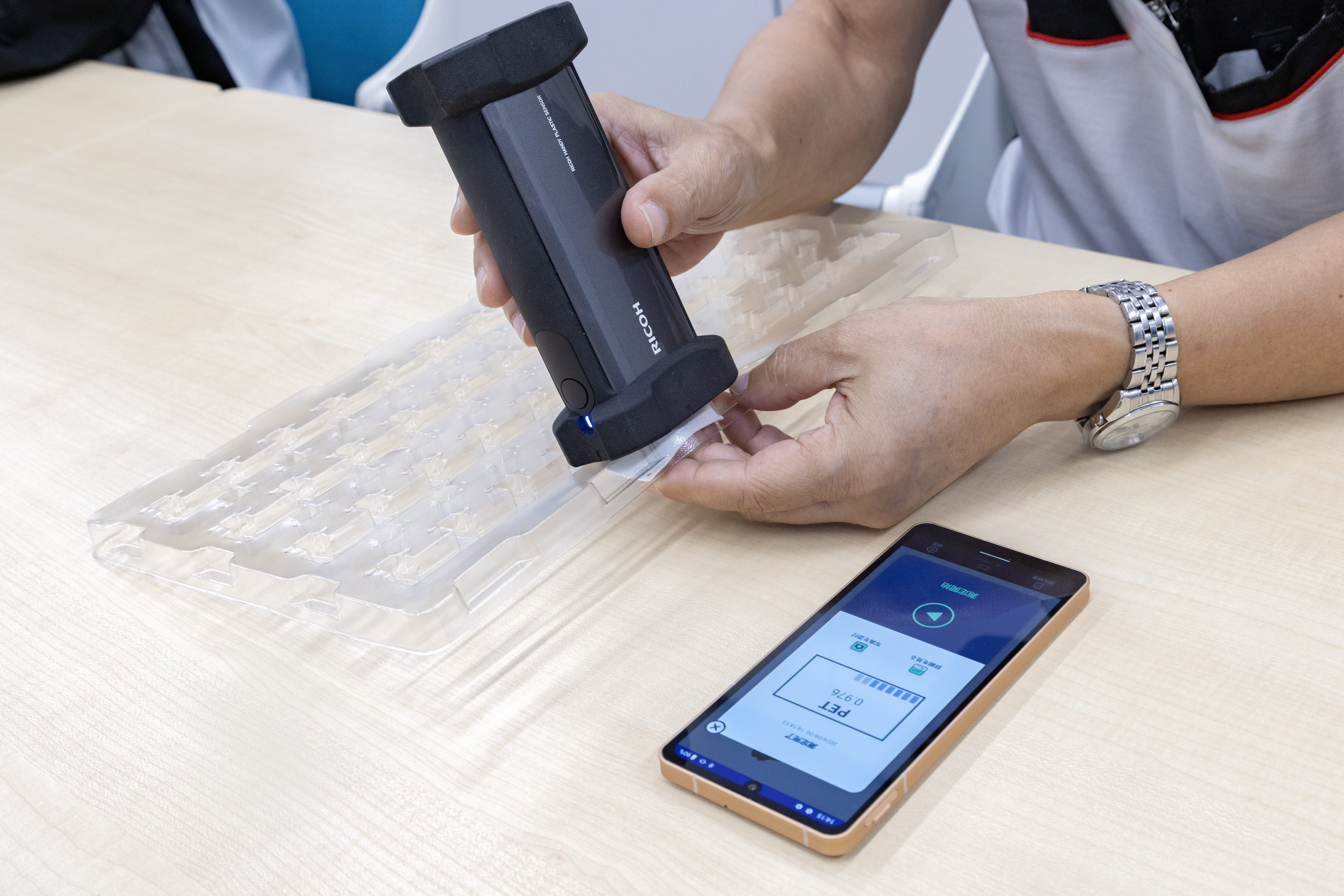 RICOHハンディセンサーを対象となるプラスチックに当てるだけで、判別結果が即座にスマホに表示される。