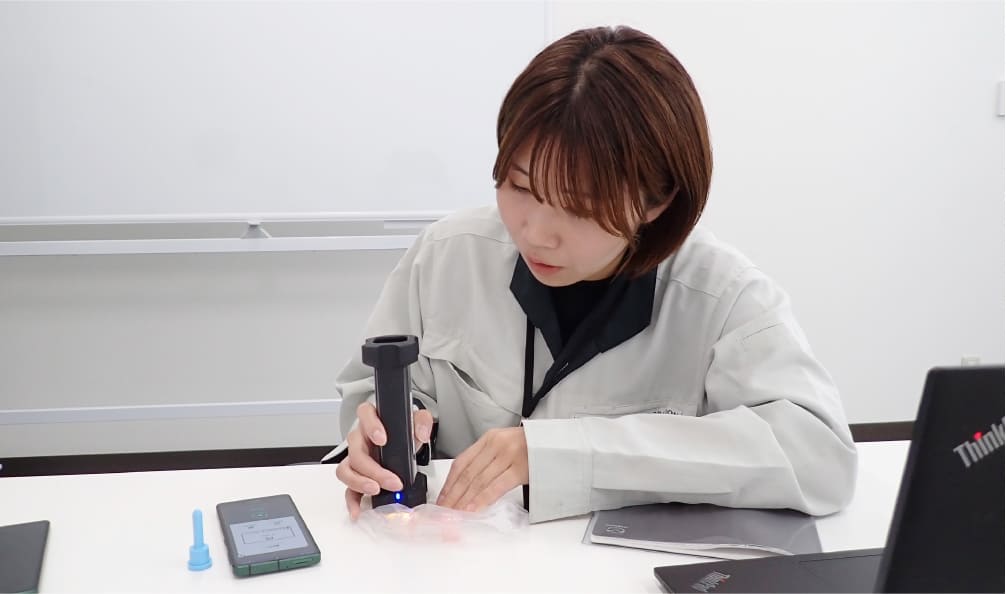 ハンディタイプで持ち運びしやすい特徴を持つセンサーなので、広い工場内でありながら、各部門に貸し出して廃プラスチックの材質の判別に活用できている。
