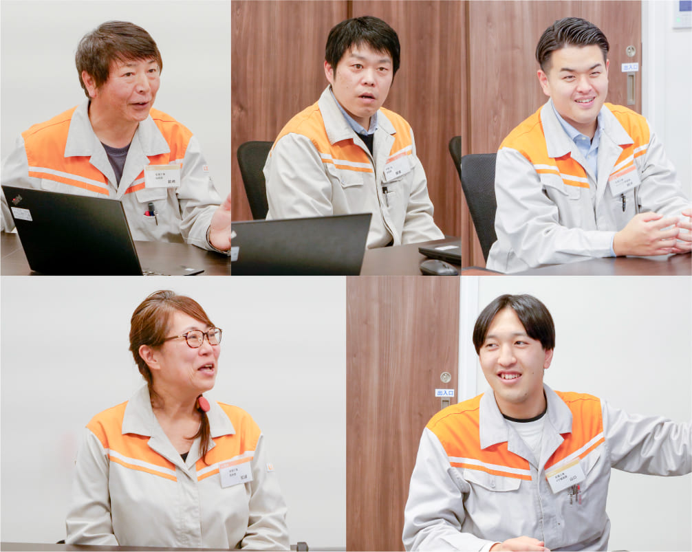 (左から)ドア製造課の山口宏仁様、インテリア製造課の細井敬太様、技術課の柳澤稔様、萩崎勝洋様、松浦教子様