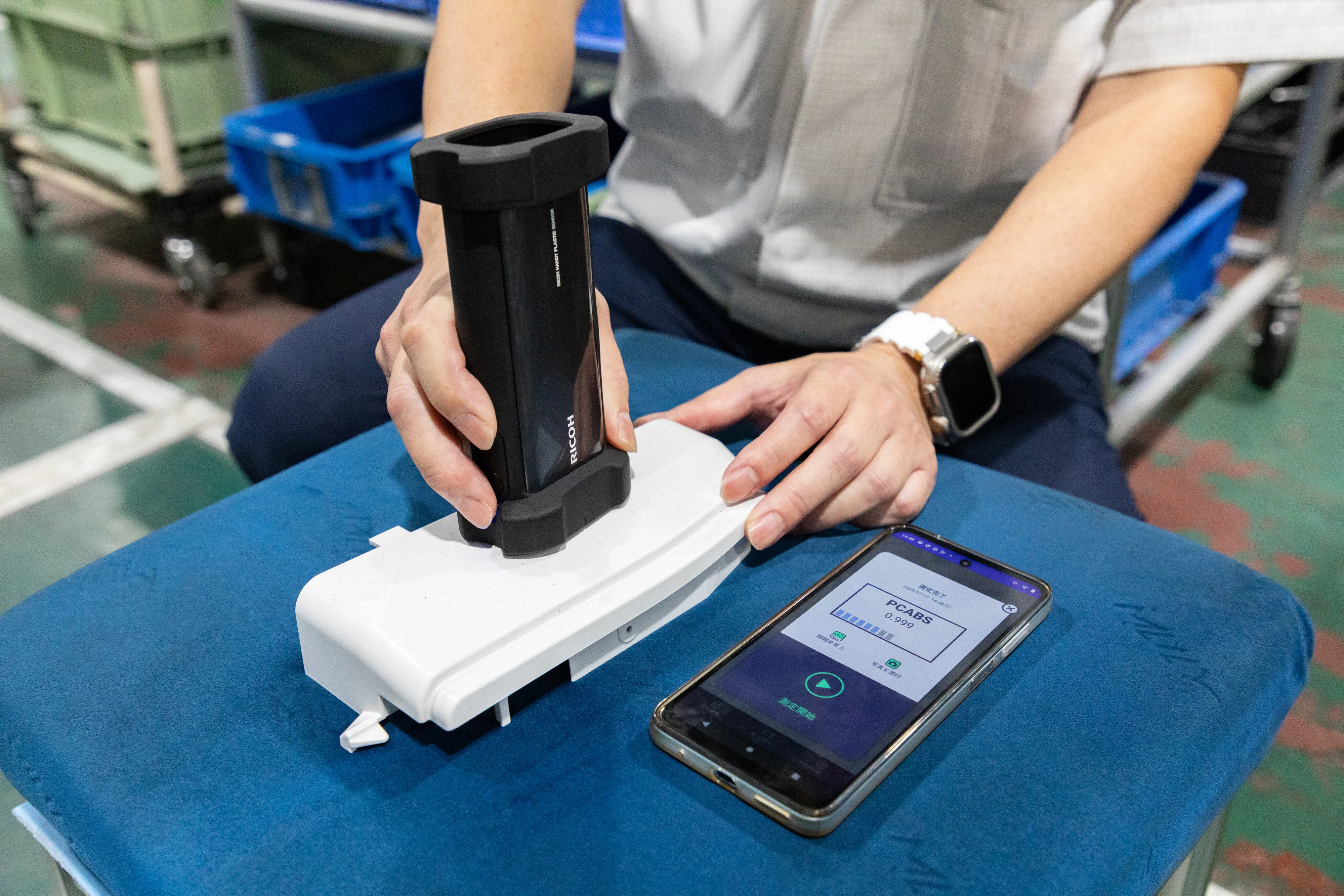 現在はイレギュラー発生時の確認用として1台を運用していますが、活用の幅はさらに広がりを見せつつあります。直面しているのは、複合機のモデルチェンジに伴う材質混在という新たな課題です。最近の複合機では、同じ外装カバーでも旧モデルが「PC(ポリカーボネート)+ABS」であるのに対し、新モデルでは「PCのみ」と、材質が変更されています。これらは再生方法が異なるため、リサイクル工程では厳密な分別が求められます。しかし、材質の刻印はカバーを分解しないと確認できないため、生産ラインの入り口での判別が不可欠です。この課題に対し、現在リコーハンディセンサー2台体制による分別作業の標準化と品質管理の徹底を図っている最中です。