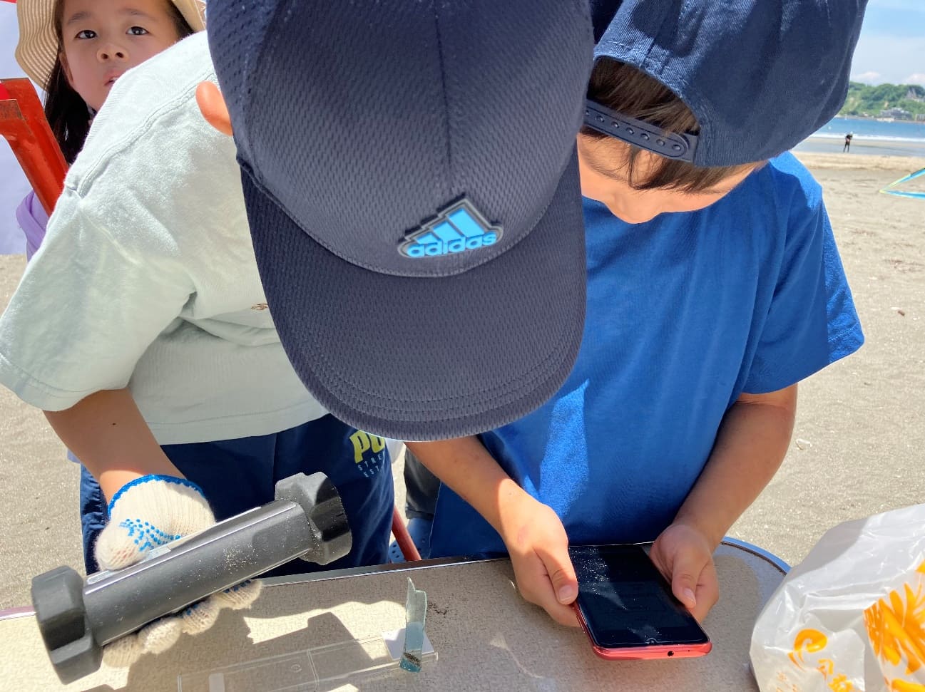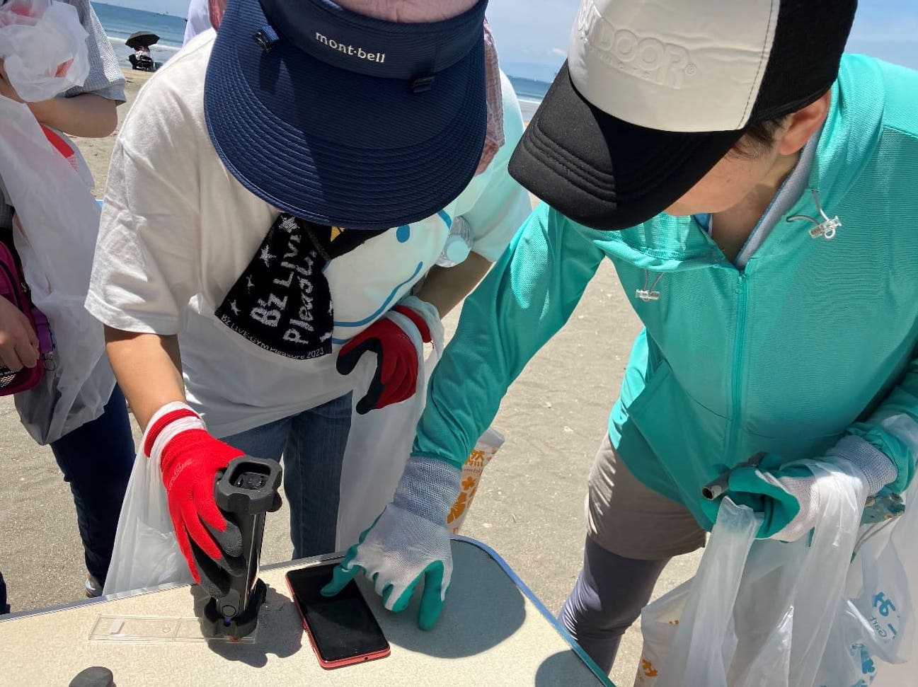 ビーチクリーンをしながら拾ったプラスチックらしきものを持ってきていただき、ハンディセンサーでの識別を試していただきました。