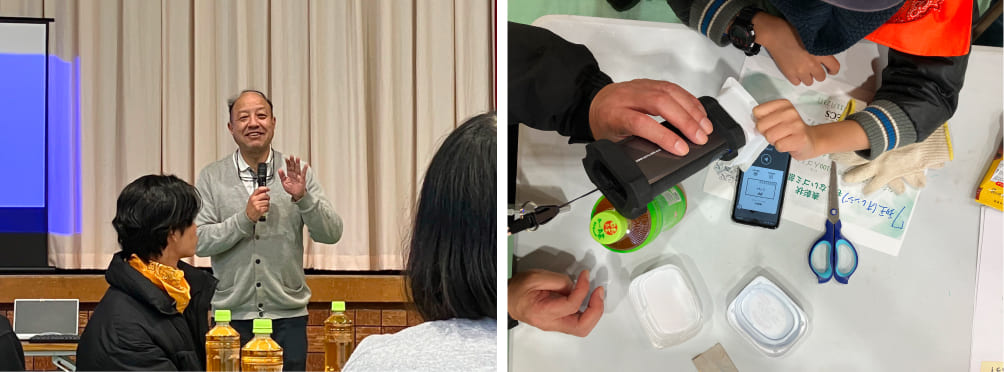 今回初めての試みとして、リコーの樹脂判別ハンディセンサーを使ったプラスチック分別体験も実施されました。小学生たちは、身近にあるプラスチックをセンサーで調べ、種類ごとに分別する活動に挑戦。プラスチックには多くの種類があり、それぞれの性質に応じた分別がリサイクルにおいて重要であることを学びました。この体験を通じて、リサイクルの基礎知識が深まるだけでなく、最新技術を活用した資源循環の可能性にも触れることができました。