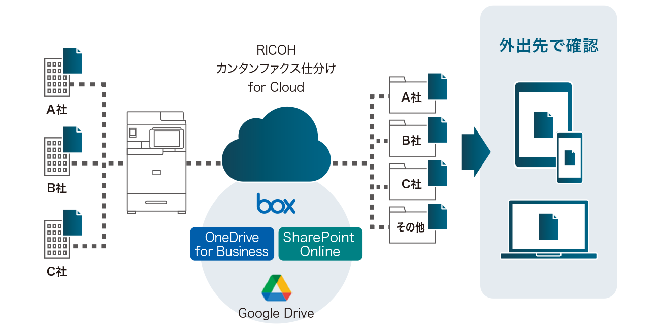 Box、DocuWare、Dropbox、Google ドライブ™、OneDrive for Business、SharePoint Onlineに対応。