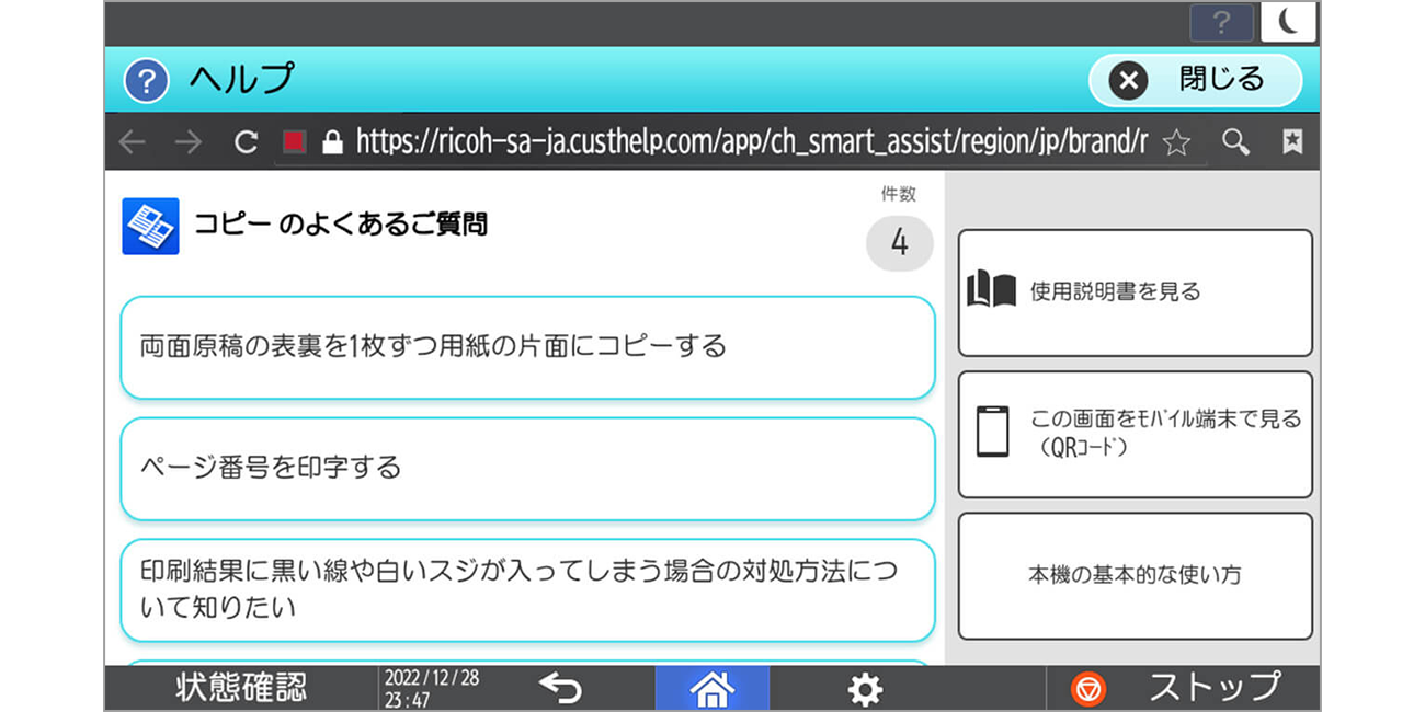 機能に関するヘルプを操作画面で確認できます。操作中の機能を自動判別し関連情報を表示するため、スピーディーにお困りごとを解決できます。QRコードを読み取ることでスマートデバイスでヘルプを確認しながら操作が可能です。