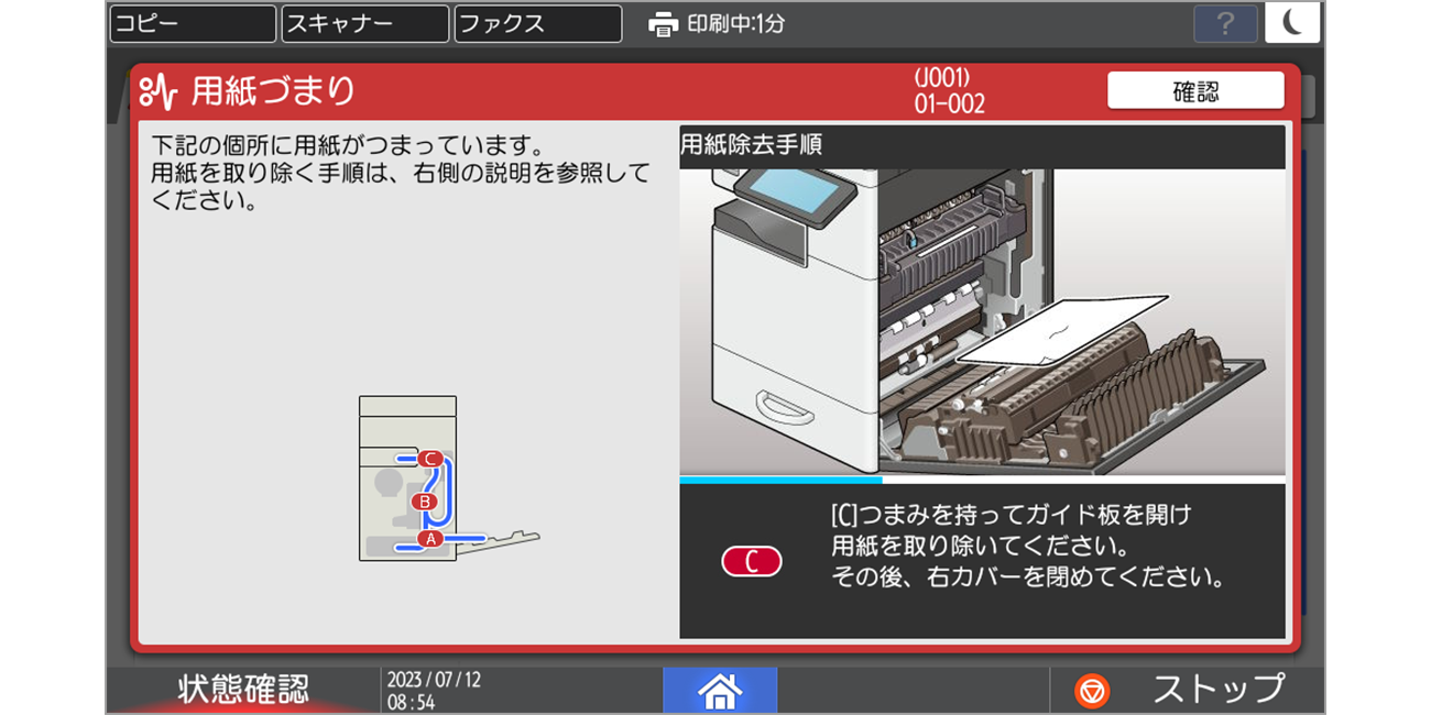 紙詰まり、用紙切れなどのエラー状態をLEDが点灯してお知らせし、エラー解決操作への移行も速やかに行なえます。また、機器の状態、実行中ジョブの状態や履歴などを一覧で確認可能です。
