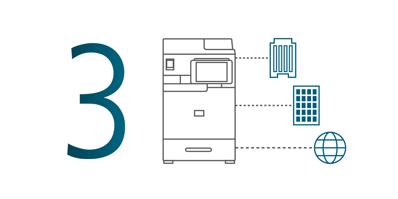 ファクスユニットを搭載していない複合機(子機)*から、ネットワーク上のファクスユニットを搭載している複合機(親機)*を通じてファクス送受信が行なえます。ファクス機能搭載機に接続した回線を利用するため、コストの削減につながります。