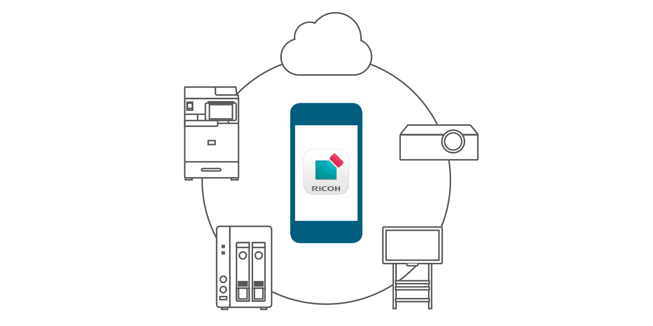タブレット端末やスマートフォンを複合機と接続することで、プリントやスキャンなどの操作ができる無料のスマートデバイス用アプリです。また、リコー製プロジェクターやインタラクティブホワイトボードとも連携したデータ共有が可能です。