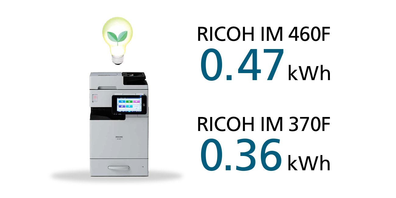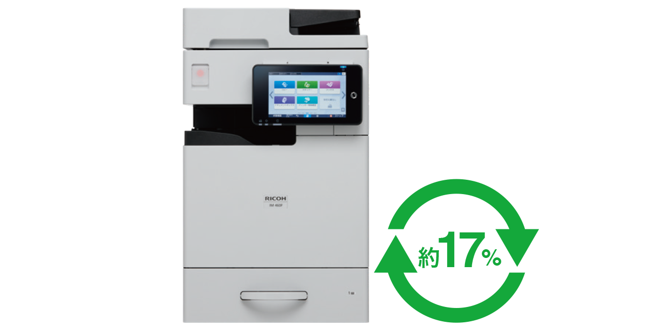 財団法人省エネルギーセンターがWebサイトに公開している国際エネルギースタープログラム使用製品(37〜46枚/分クラスのコピー/ファクス/スキャナー機能付きのデジタル複合機)との比較において。 2023年7月現在。リコー調べ。