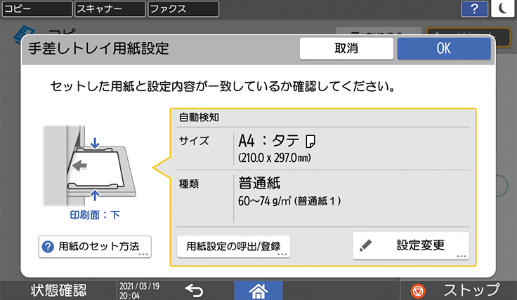 コピー時に手差しトレイへ用紙をセットすると、自動検知したサイズを表示。画面の指示に従って設定変更も簡単にでき、サイズ違いによる紙詰まりを防止します。