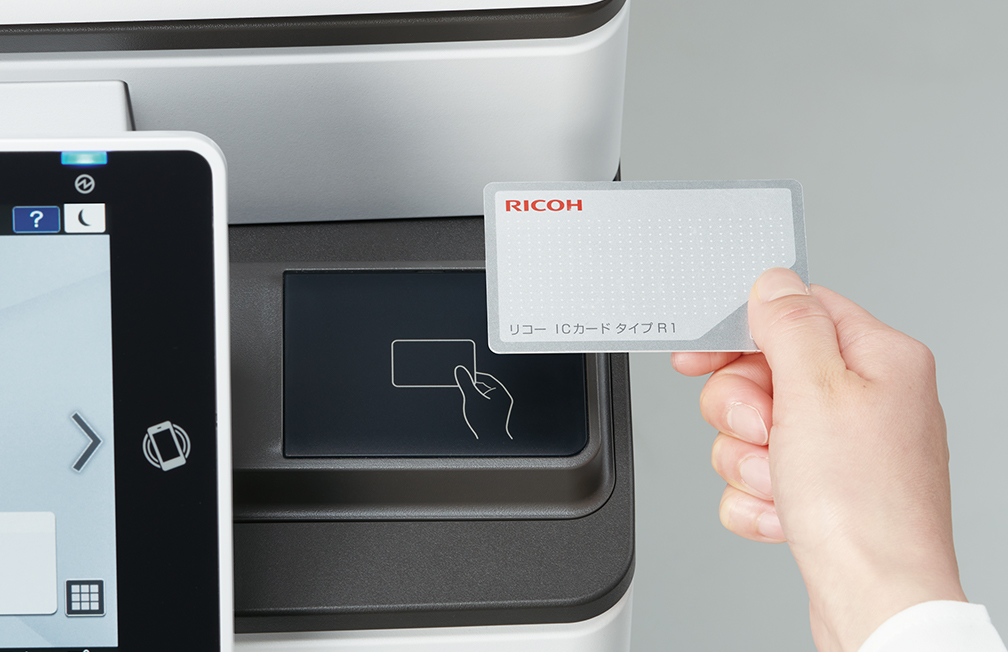 非接触ICカード「FeliCa」*1「MIFARE」*2を用いた個人認証が可能です。機器の利用を簡単に制限でき情報漏えいリスクを軽減します。さらにRICOHカンタン入出力を利用することでスマートデバイスによる認証も可能です。