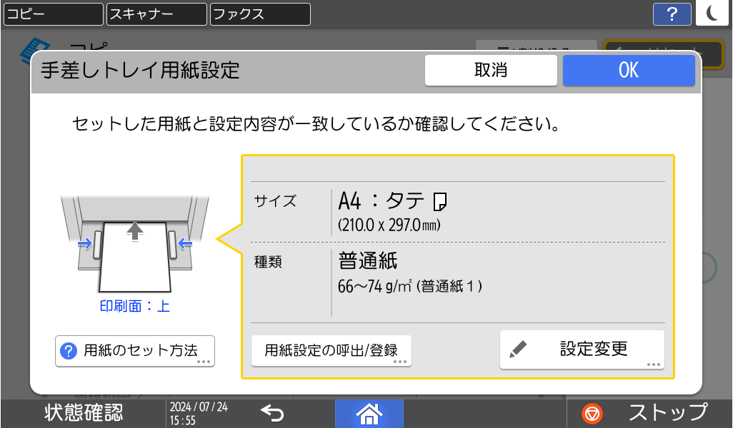 手差しトレイへ用紙をセットすると、現在設定されている用紙種類・サイズの確認や、設定変更が簡単にできるポップアップを表示。様々な用紙種類・用紙サイズを利用する際に、どなたでも簡単に設定変更が可能です。