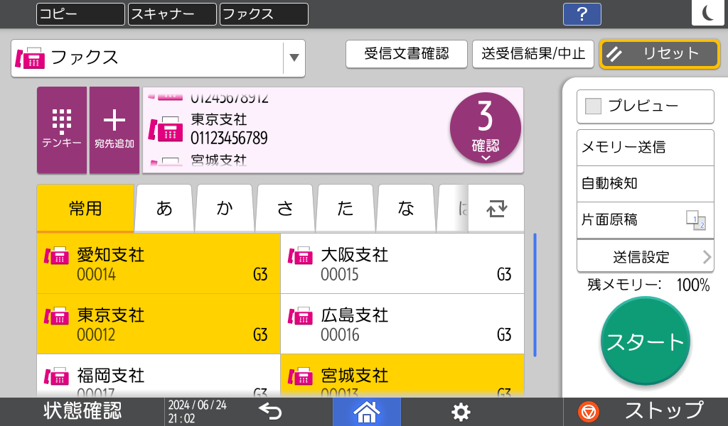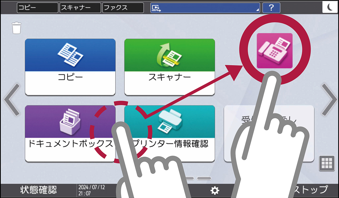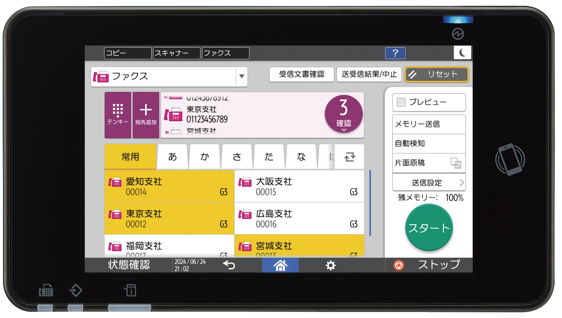 ファクス番号は、テンキーで直接入力できます。また、登録された宛先の選択や、各種送信設定も見やすく大きなアイコンで表示され、どなたも簡単にファクスをご利用いただけます。