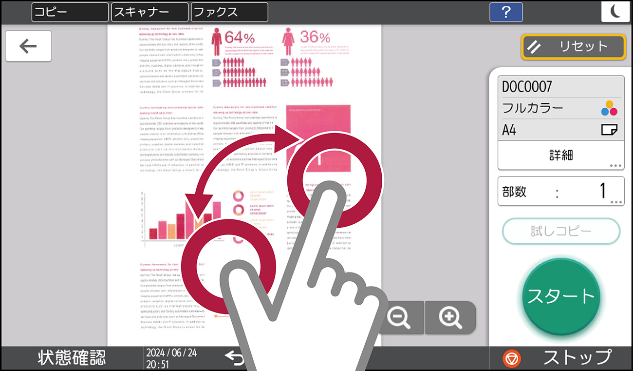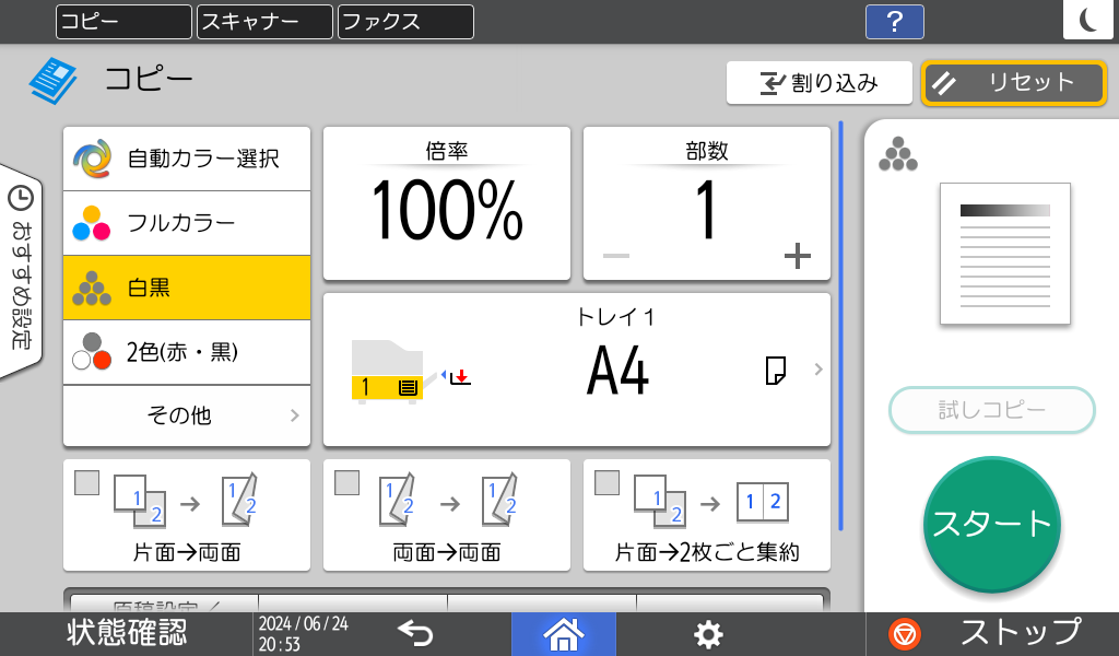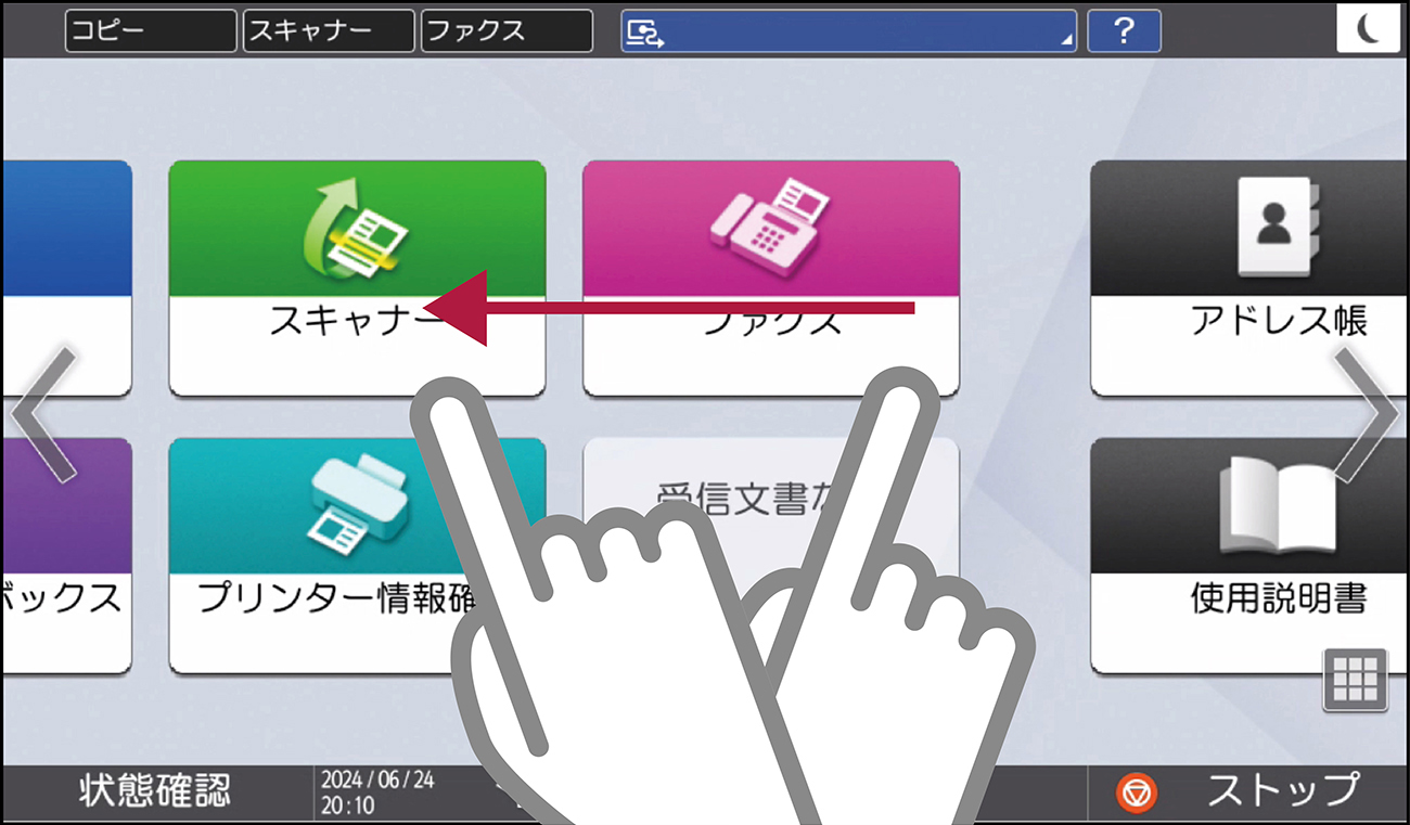 直感的な操作で機能を活用できるコピー/スキャナー/ファクス/ドキュメントボックス画面。よく使われる機能を画面上部に配置し、大きなアイコン表示で設定が見やすいユーザーインターフェースです。