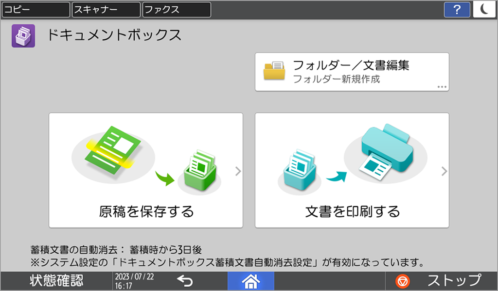 ドキュメントボックスに蓄積された文書は、出荷時には3日(72時間)後に消去されるように設定されています。