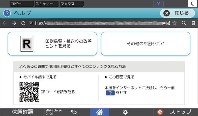 操作中の機能を自動判別し関連情報を表示するため、スピーディーにお困りごとを解決できます。QRコードを読み取ることでスマートデバイスでヘルプを確認しながら操作が可能です。