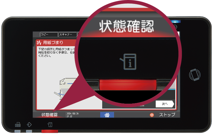 紙詰まり、用紙切れなどのエラー状態をLEDが点灯してお知らせし、エラー解決操作への移行も速やかに行なえます。また、機器の状態、実行中ジョブの状態や履歴などを一覧で確認可能です。