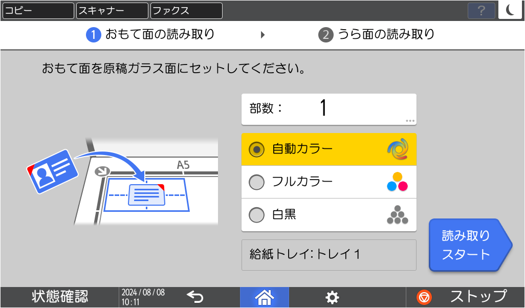 カードの表面・裏面を読み取り、用紙の上下に集約してコピーできます。例えば免許証や保険証などの控えをとる際に便利です。