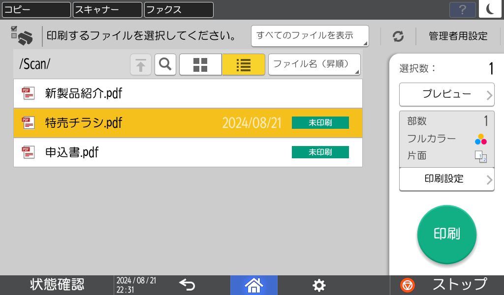 複合機から共有フォルダー内の文書を選択して印刷することができます。例えばチラシなどを簡単に印刷できます。印刷条件の保存も可能です。