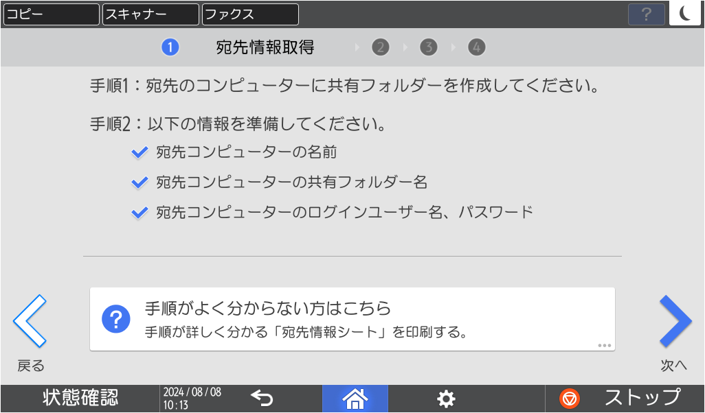 操作ガイドに従って設定すれば、読み取った文書の送信先フォルダーをアドレス帳に簡単に登録できます。宛先情報シートを印刷すれば必要な情報をもれなく確認できます。