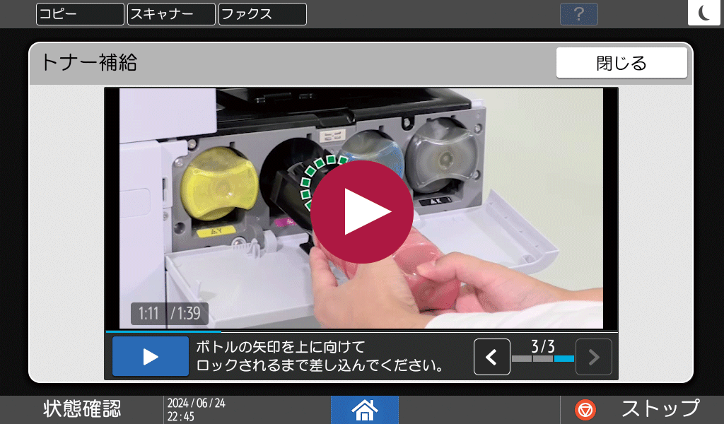 トナー、廃トナーボトルの交換手順を動画で表示します。