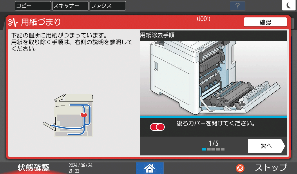 紙詰まり処理などの手順をアニメーションで説明。処理の進捗をリアルタイムで表示します。
