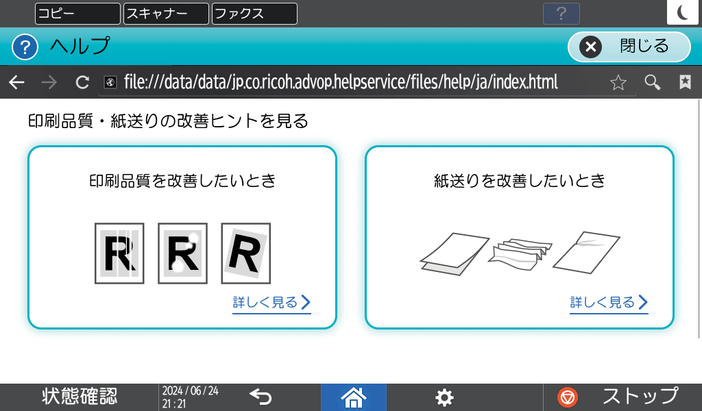 消耗品の交換動画や紙詰まり除去のアニメーションなどで、日々のメンテナンスをどなたでも実施いただけるようわかりやすくサポートします。