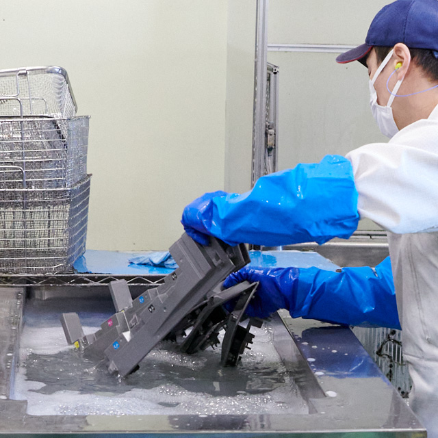 リユース部品のうち、形状が複雑でサイズが大きいものなどは水洗いします。