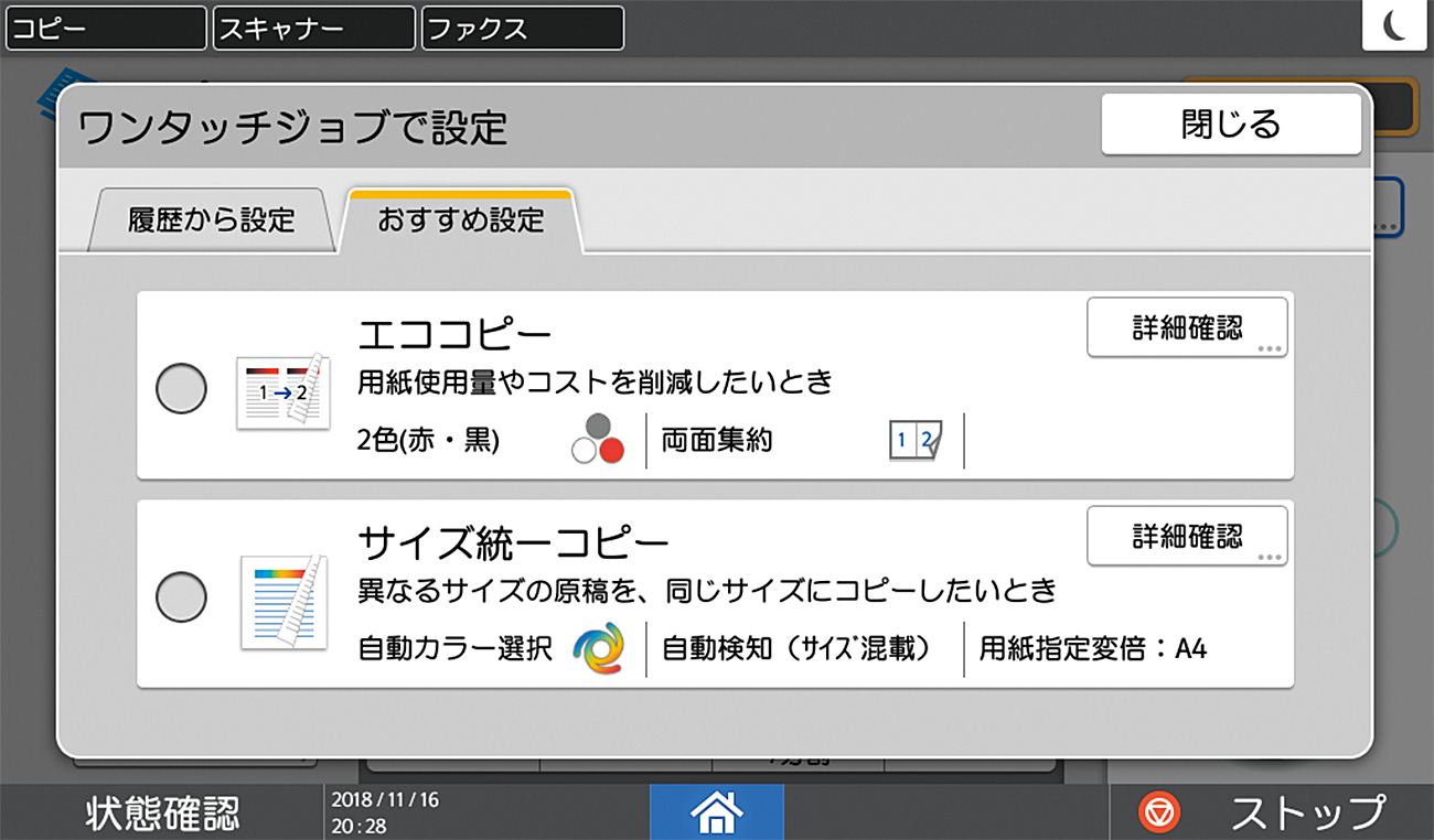 紙詰まり、用紙切れなどのエラー状態をLEDが点灯してお知らせし、エラー解決操作への移行も速やかに行なえます。また、実行中ジョブの状態や履歴を一覧で確認可能です。