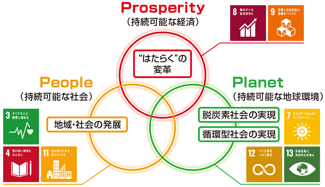 リコーグループは目指すべき持続可能な社会の姿を、経済(Prosperity)、社会(People)、地球環境(Planet)のバランスが取れていることが必要と考えます。持続可能な社会の実現のため、SDGsを踏まえ7つのマテリアリティを定めています。その中の「事業を通じた社会課題解決」を目指す4つのマテリアリティに対して、製品での貢献も目指しています。