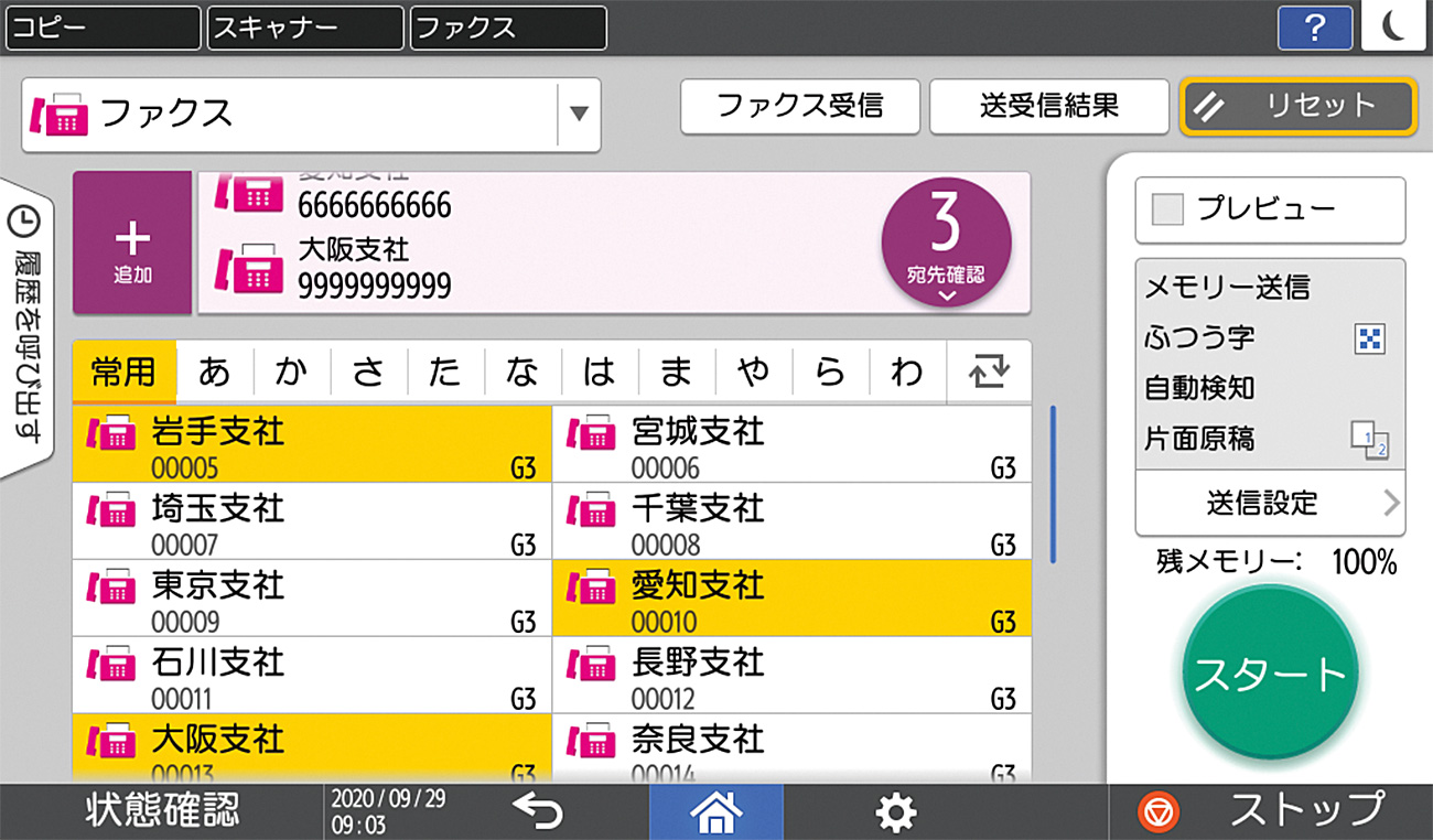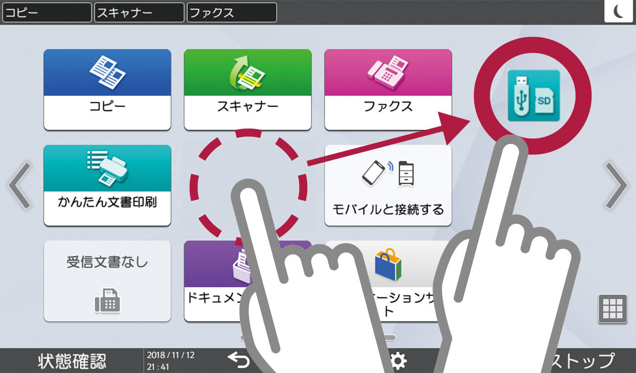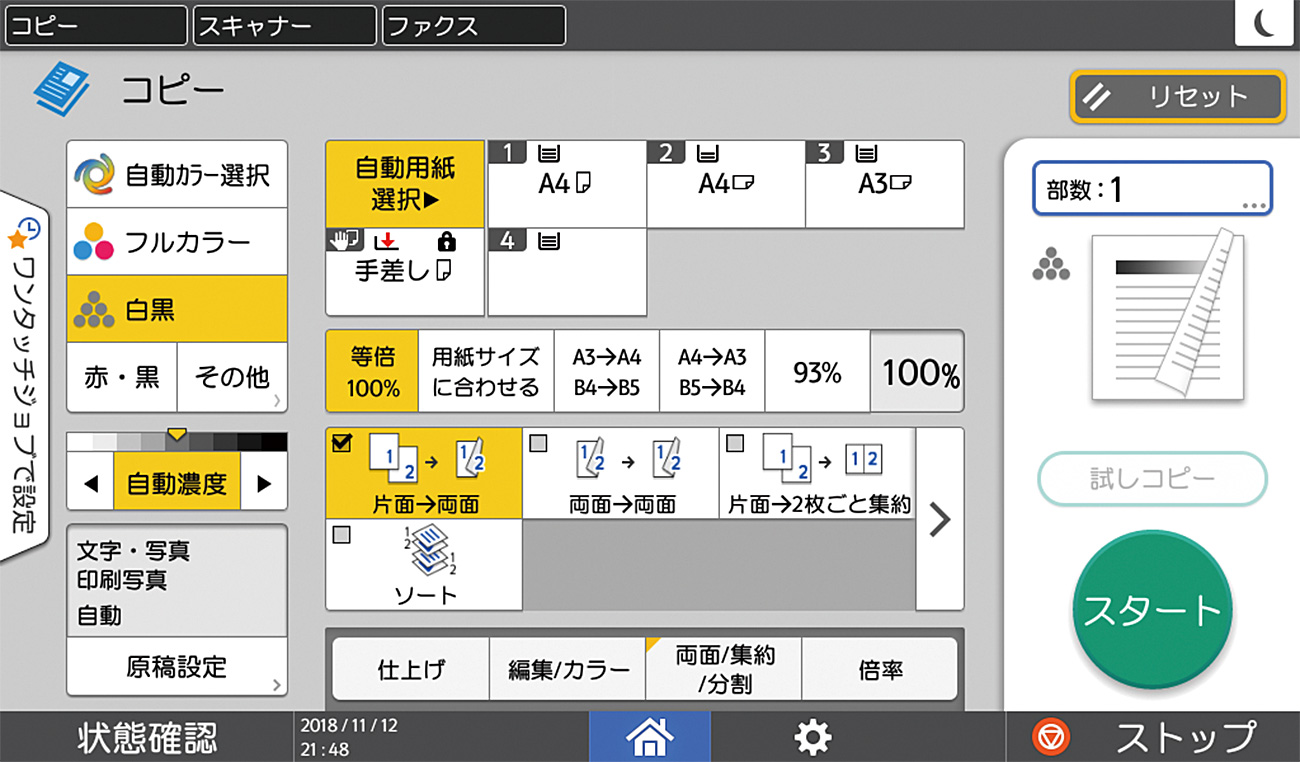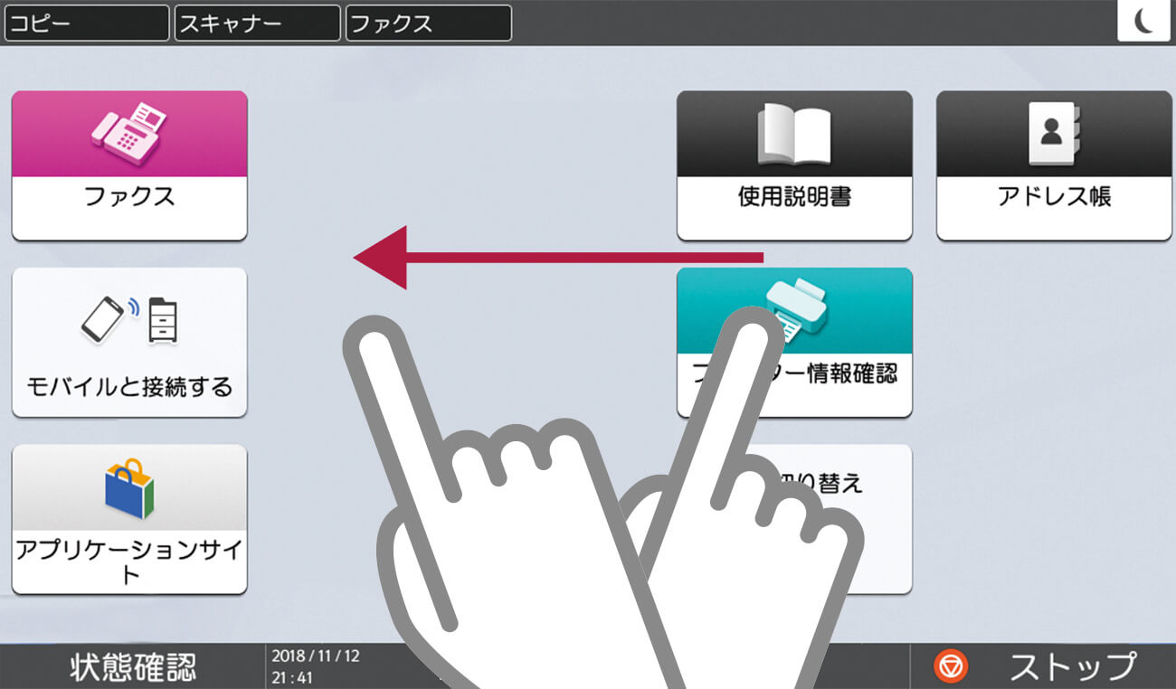 直感的な操作で機能を活用しやすい、コピー/スキャナー/ファクス画面。よく使われる機能を画面上部に配置し、見やすい大きなアイコン表示で設定もわかりやすいユーザーインターフェイスです。