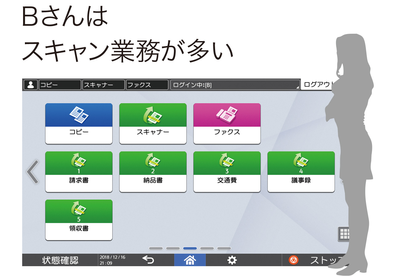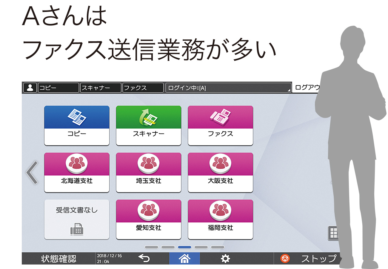 設定キーのレイアウトを変更できます。よく利用する設定キーを上部に配置したり、利用しない設定キーを非表示にできます。ユーザー認証と組み合わせれば、利用者ごとのカスタマイズも可能です。