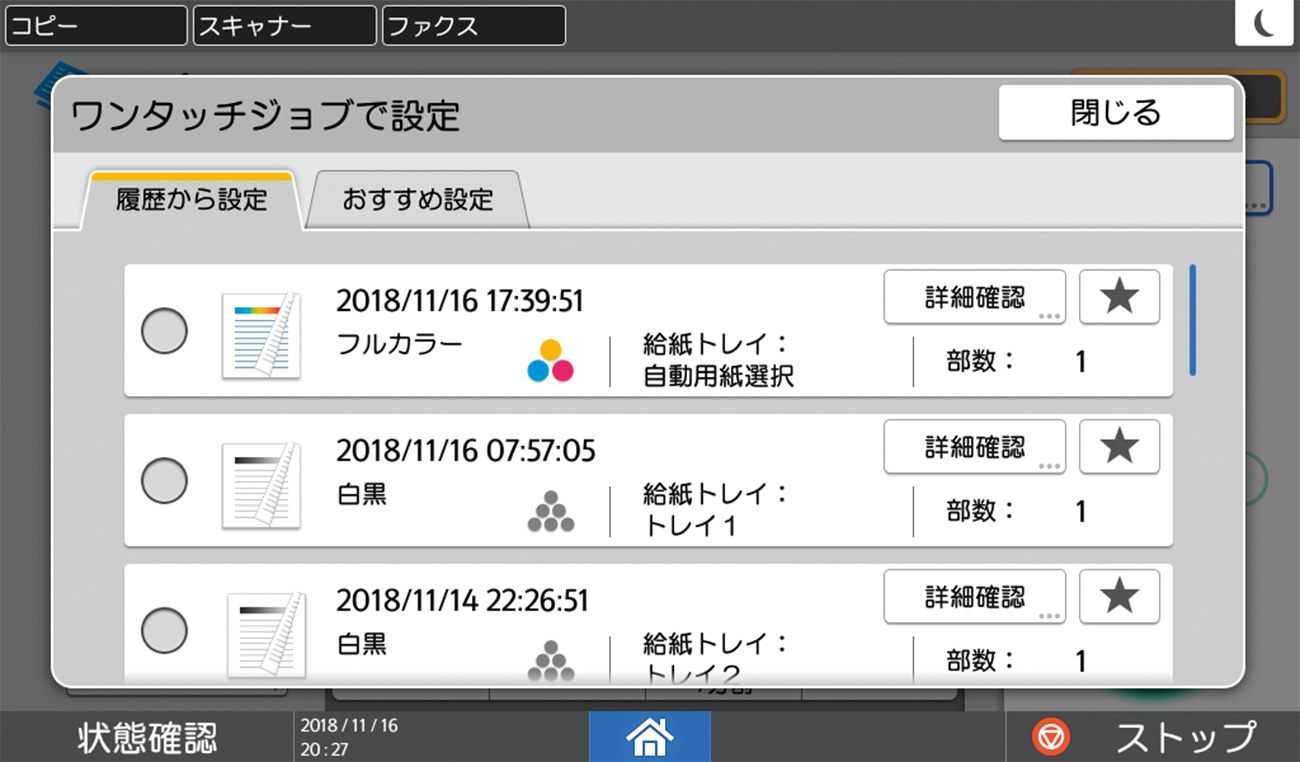 直近10件までの操作履歴を表示できます。さらに定型業務での操作やよく使う機能の履歴をお気に入りに設定すれば、何度でも呼び出せます。また、おすすめ設定にはあらかじめ便利な設定が登録されています。