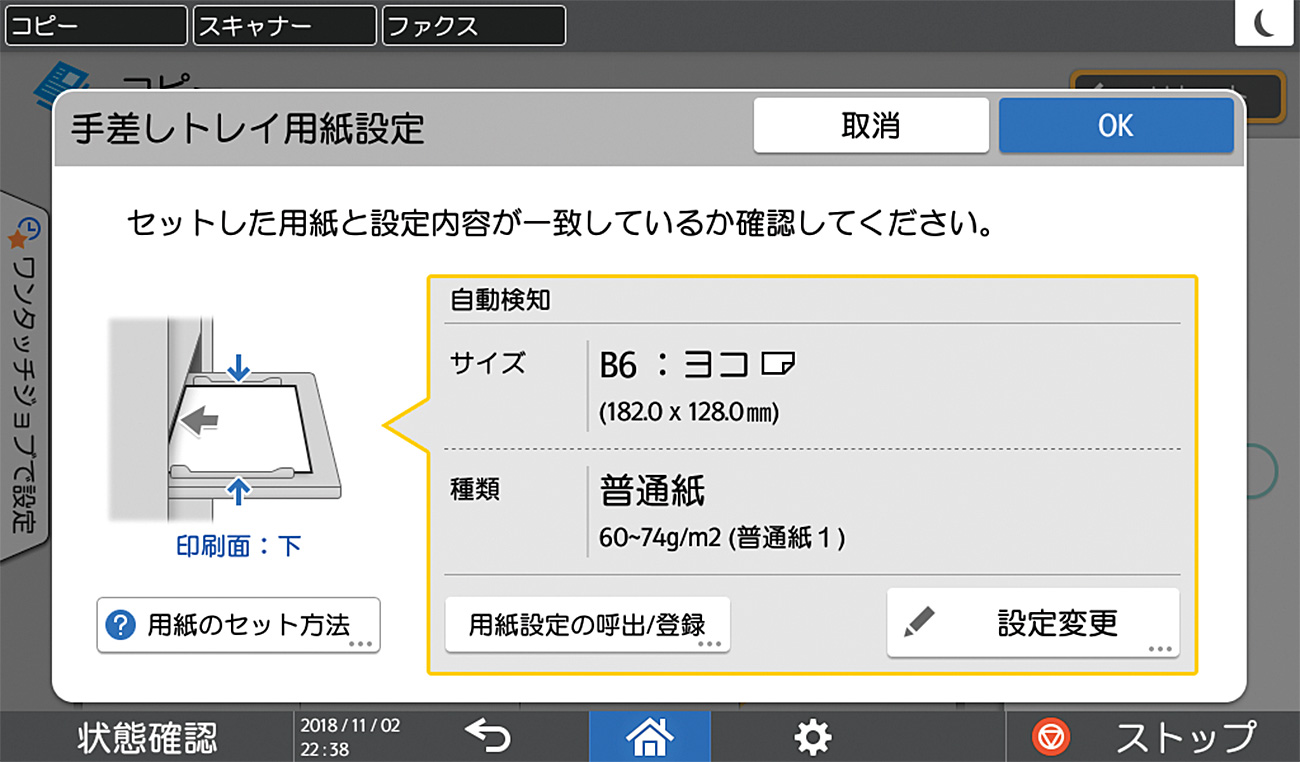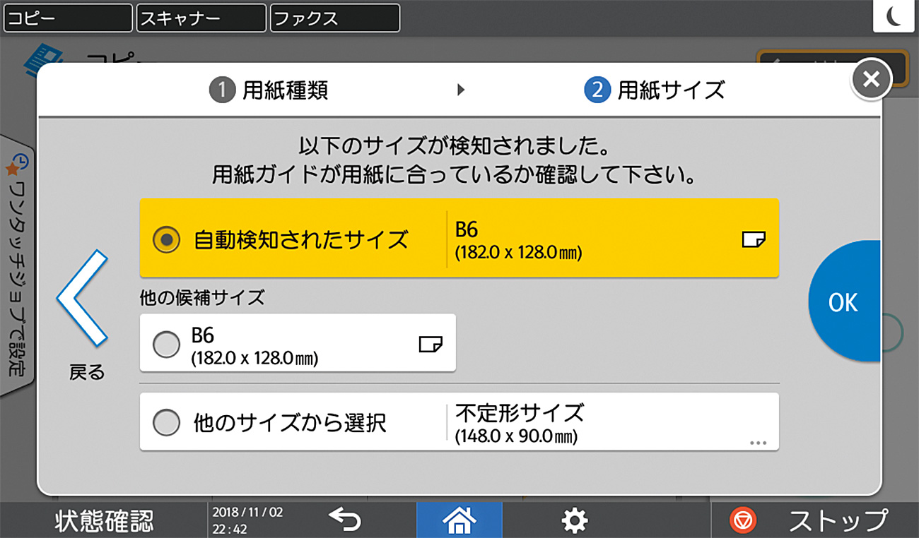 コピー時に手差しトレイへ用紙をセットすると、自動検知したサイズを表示。ウィザードで簡単に設定変更もでき、サイズ違いによる紙詰まりを防止します。