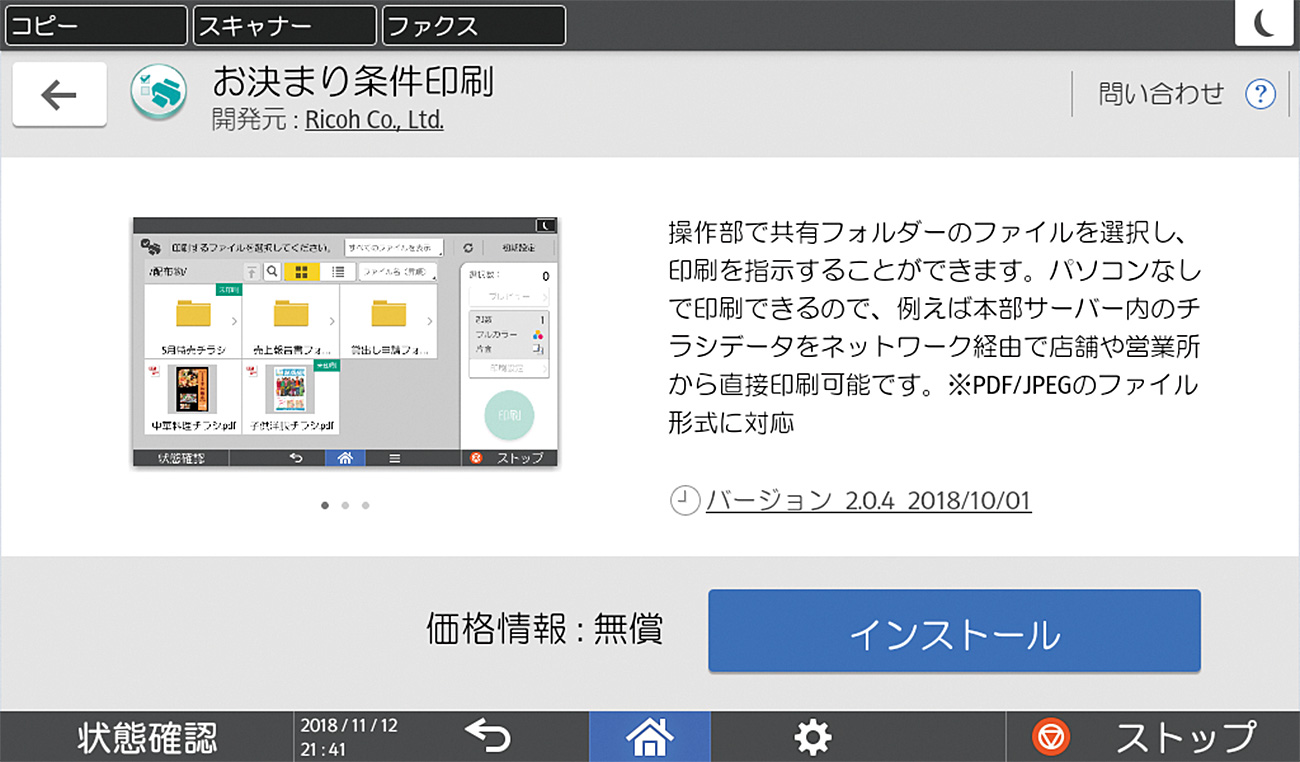 複合機に搭載されているソフトウェアをバージョンアップすることで、機器に新しい機能をネットワーク経由で追加できる仕組み「RICOH Always Current Technology」に対応。最新のセキュリティー機能や自社の業務に合う機能・アプリケーションを手軽に利用できるようになります。随時アップデートするリコーの複合機がお客様の「はたらく」を応援します。