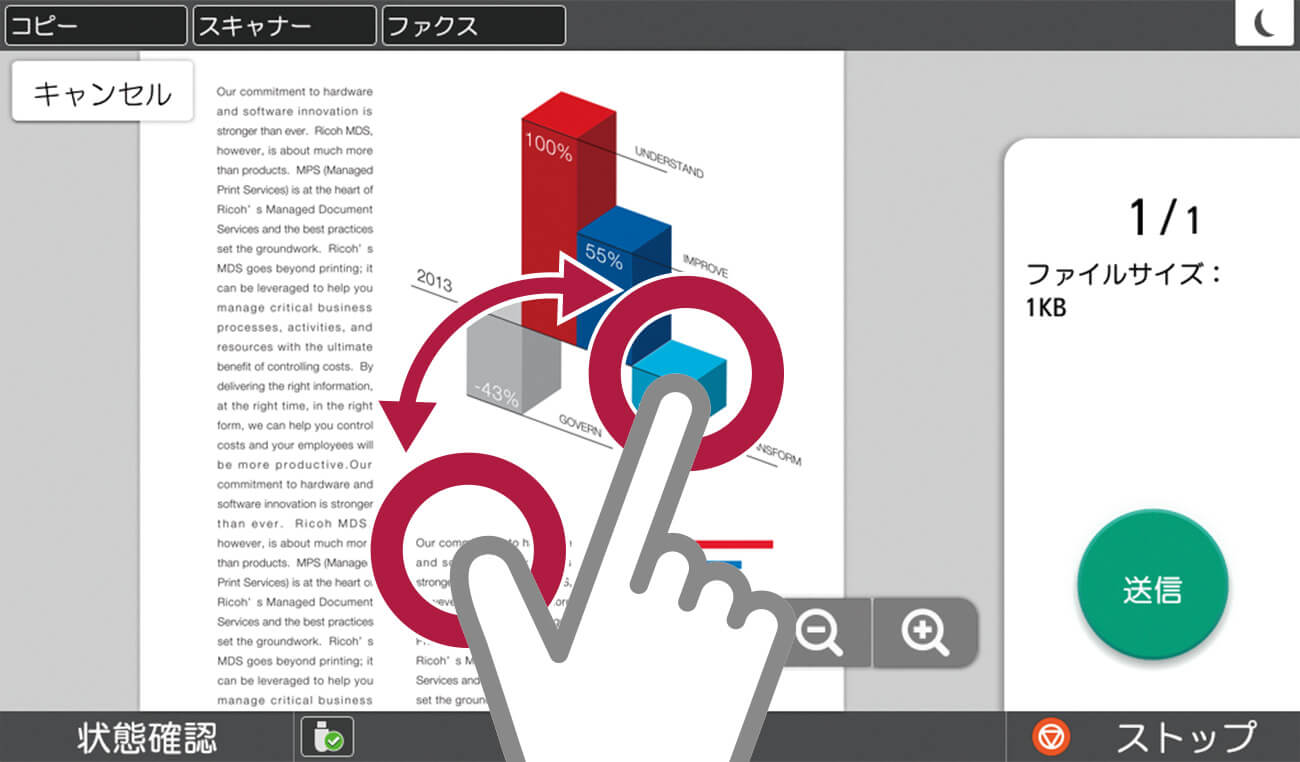 仕上がりイメージを選び、配布する資料をコピーで作成。マル秘などのスタンプやページ印字も、簡単操作で設定可能です。