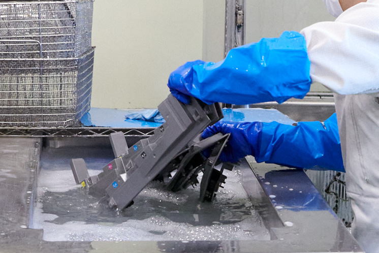リユース部品のうち、形状が複雑でサイズが大きいものなどは水洗いします。