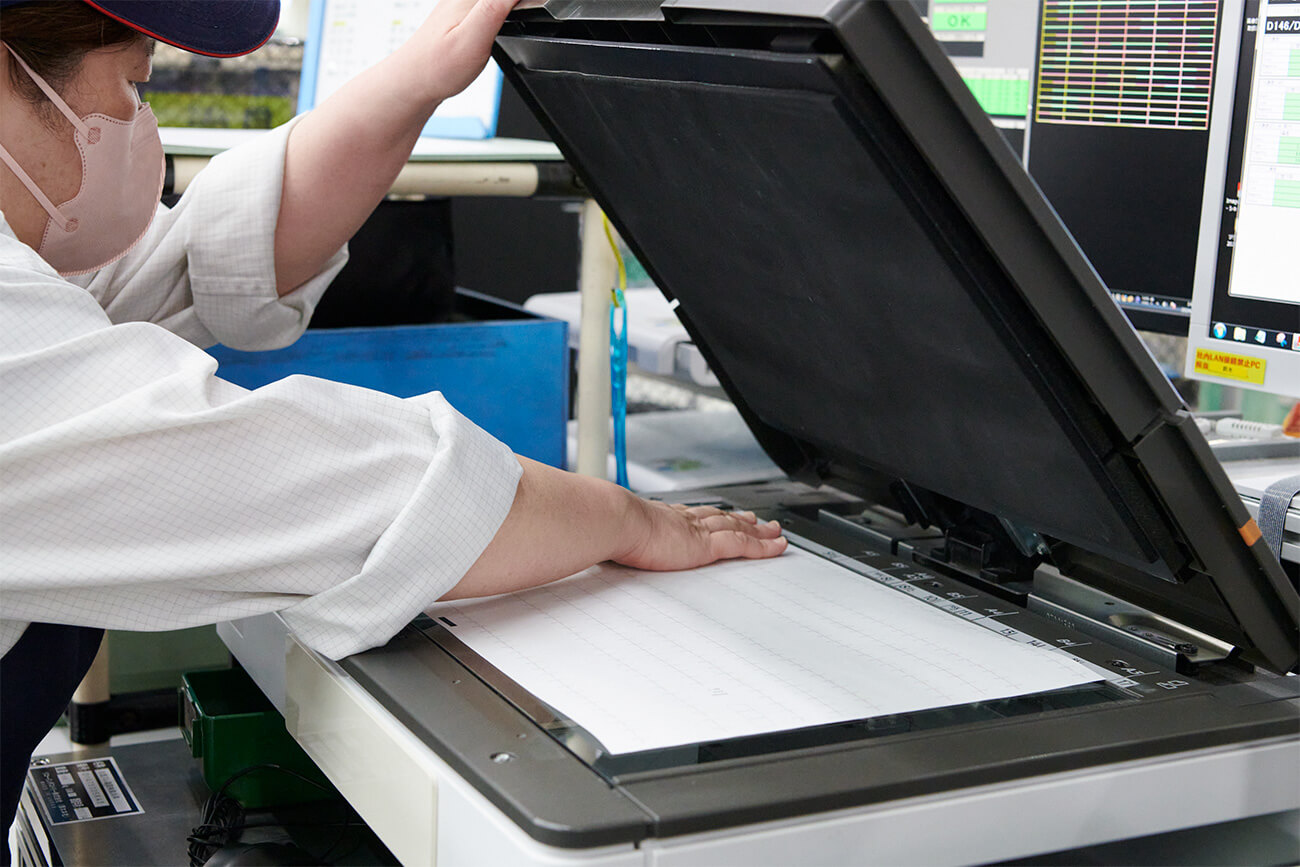 画像の位置や色味などを調整し、新造機と同一の品質基準で検査を行ないます。