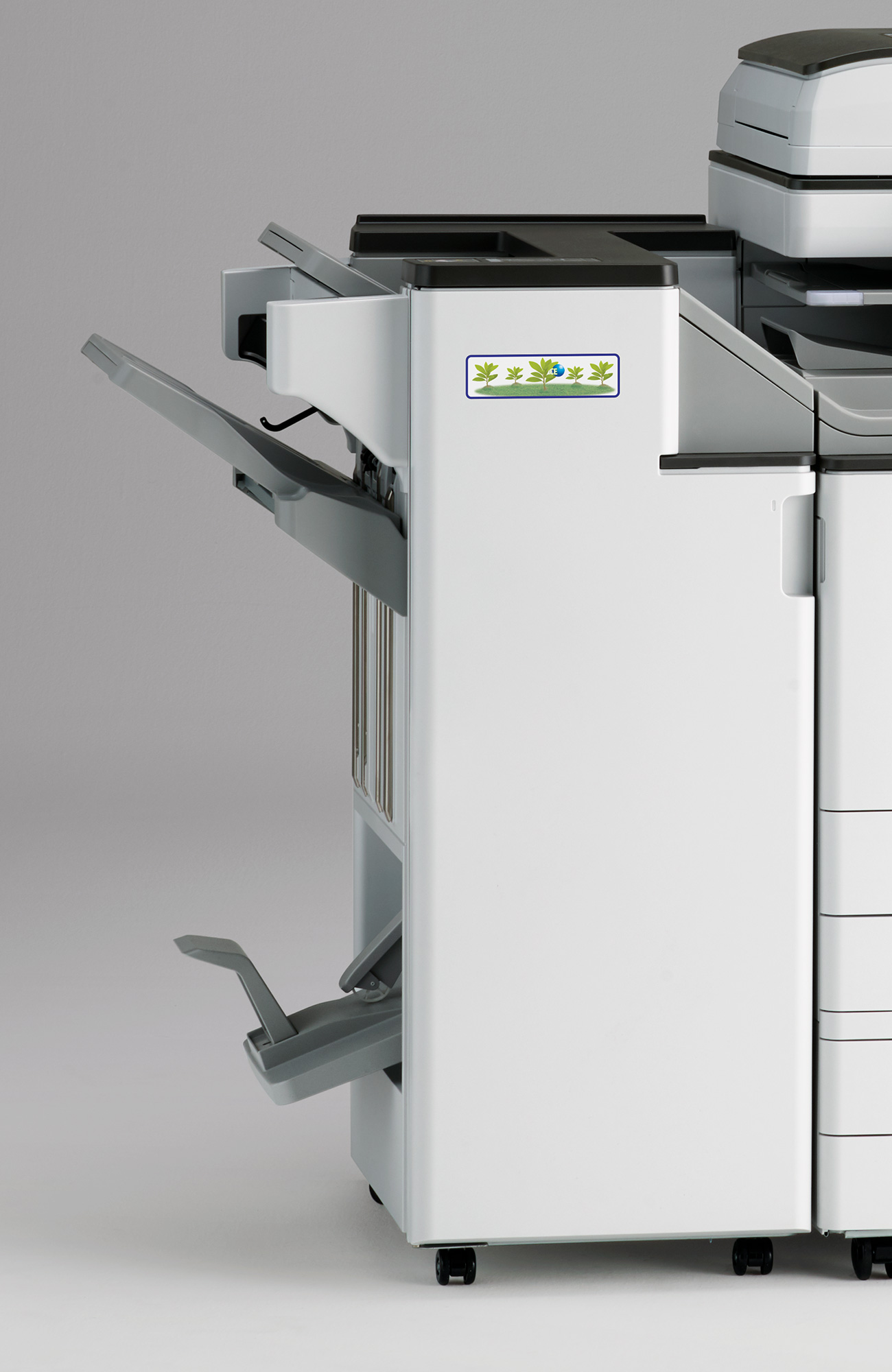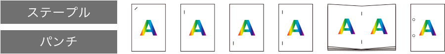 RICOH IM C6000F CE/C4500F CEは、最大2,000枚(A4)排紙でき、中綴じや多彩なステープル(奥1ヶ所斜め綴じ、奥1ヶ所綴じ、手前1ヶ所綴じ、2ヶ所綴じ)、5枚までの重ね二つ折り*、シフトソート、パンチ穴開け、サイズ混載ステープルなどが可能なフィニッシャーをオプションでご用意しています。