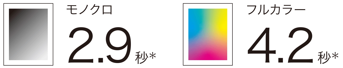 ファーストコピータイムは、モノクロで2.9秒*、フルカラーで4.2秒*と高速。お客様をお待たせすることなく業務効率アップに貢献します。