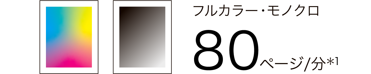 読み取り速度は、フルカラー・モノクロ:80ページ/分*1。さらにモノクロ/カラー混在時のカラースキャンでもモノクロ原稿を自動判別*2して読み取ることができます。