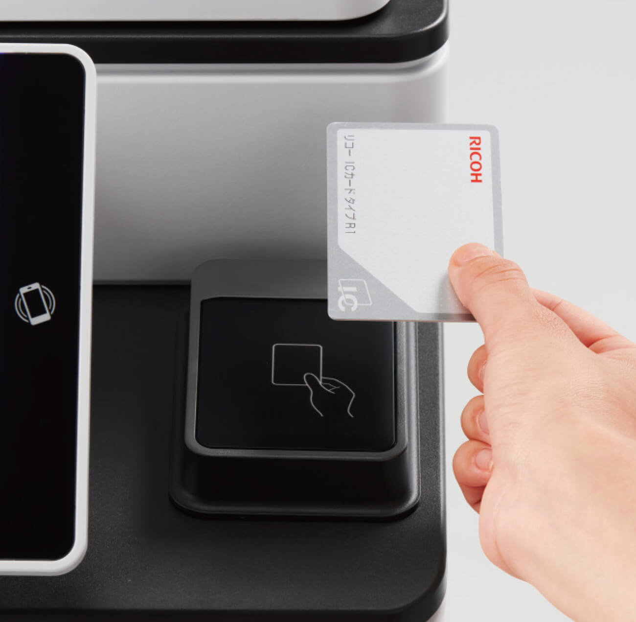 非接触ICカード「FeliCa」「MIFARE」「eLWISE」を用いた個人認証システムとして、リコー個人認証システム AE2、RICOH カンタンセキュアプリント forCloudをオプションでご用意。ICカードの汎用領域の情報で認証したり、Windows Active DirectoryやLDAPと連携することが可能です。