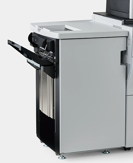 3,200枚(A4ヨコ)スタックできるフィニッシャー。65枚の5ポジションステープル、20枚の中綴じステープル、5枚の重ね二つ折り、丁合、仕分け、2穴パンチ機能*に対応しています。