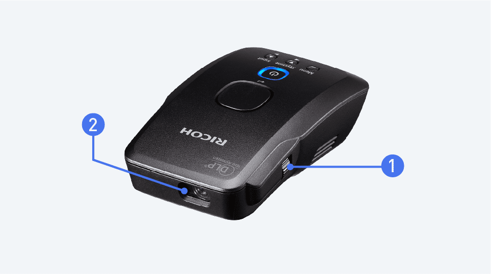 A投影のOn/Offを行うキーです。本キーの投影のOn/Offは映像接続を維持したまま行うことが出来ます。スマートフォン等との接続をあらかじめ設定したのち投影をOffにして待ち、必要なタイミングになったらすぐに投影をOnにするとういうような使い方も可能です。本キーで必要な時にだけ投影を行うことで電池の消費を抑えられたり、投影光を不用意に他人に入れることを防ぎます。