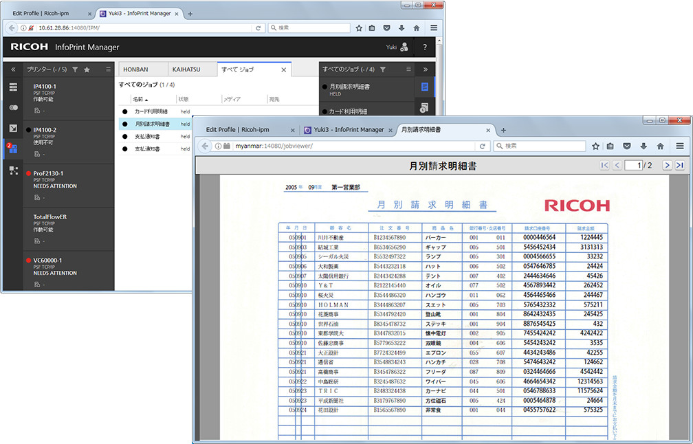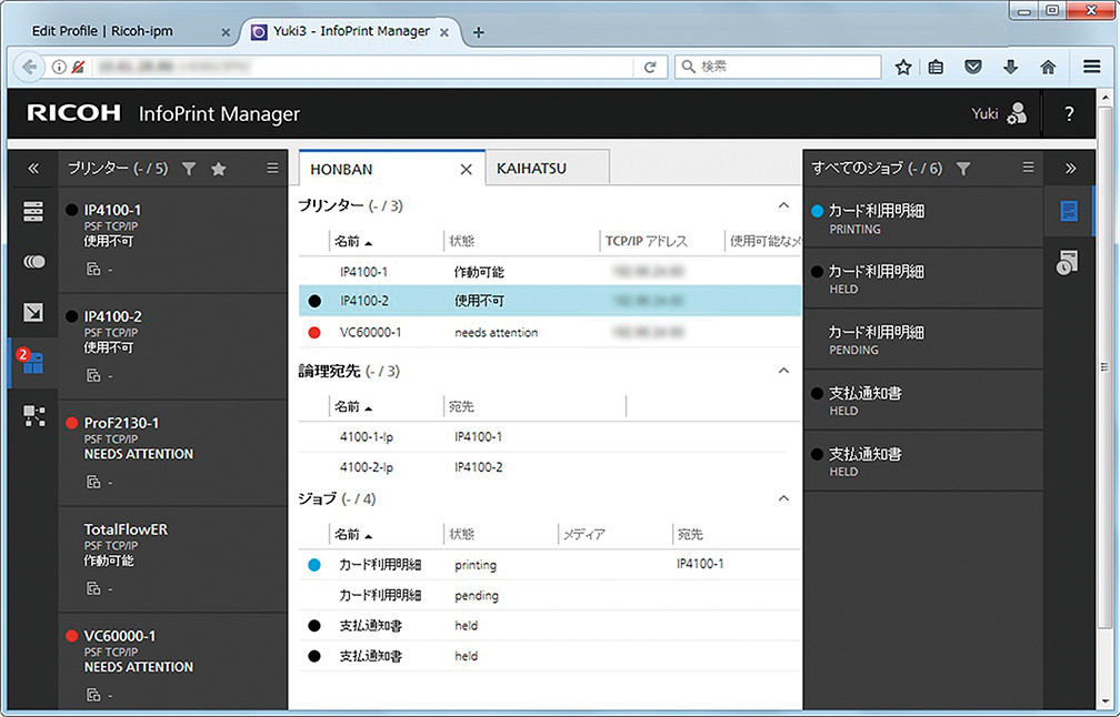 複数のプリンターの稼働状況やジョブの出力状況を把握できます。