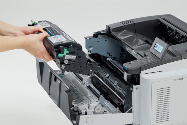 オペレーションパネルの操作はもちろん、用紙補給、トナー/ドラムユニット交換など、日常的なプリンターの操作やメンテナンスは前面操作で可能。使いやすさを何よりも重視した設計です。